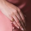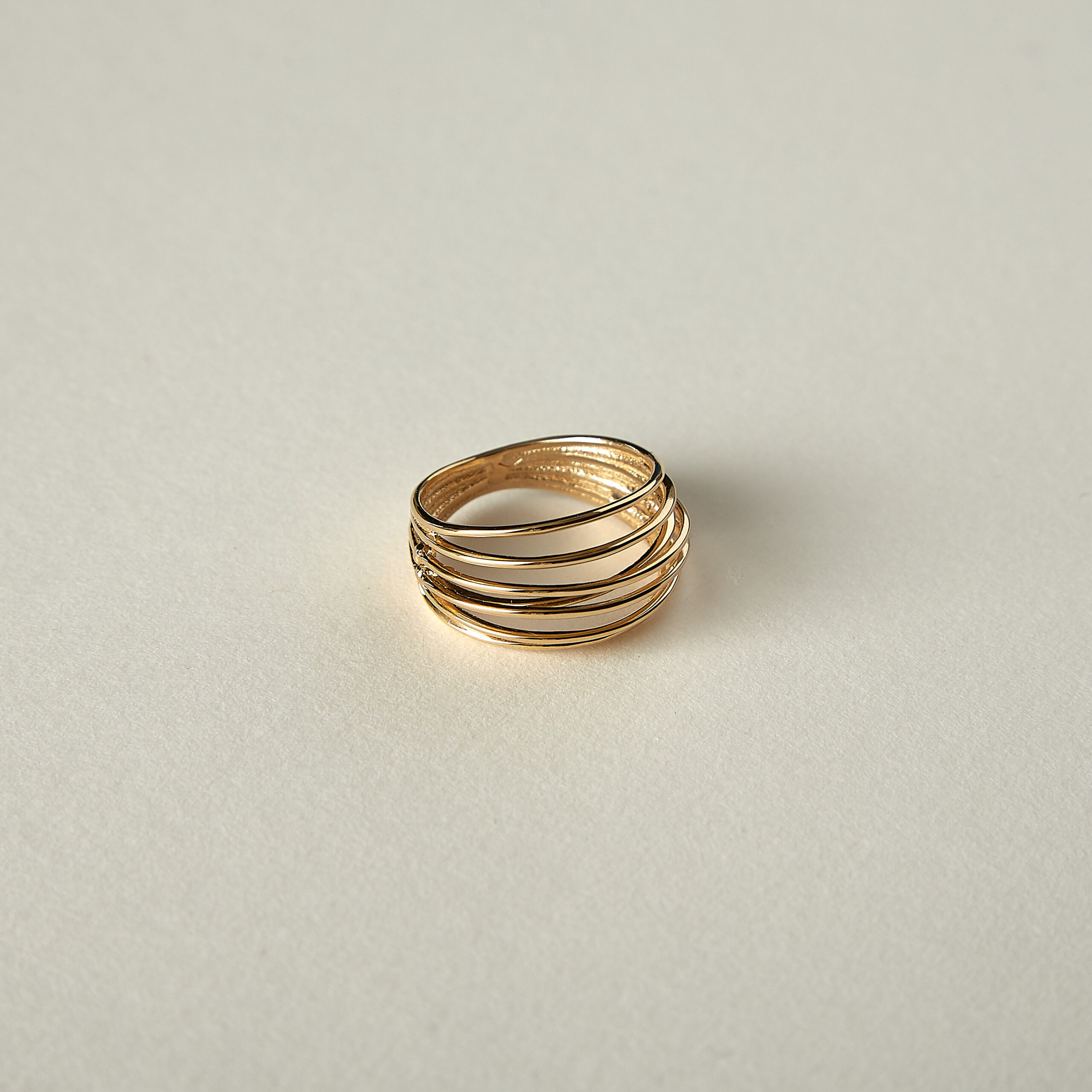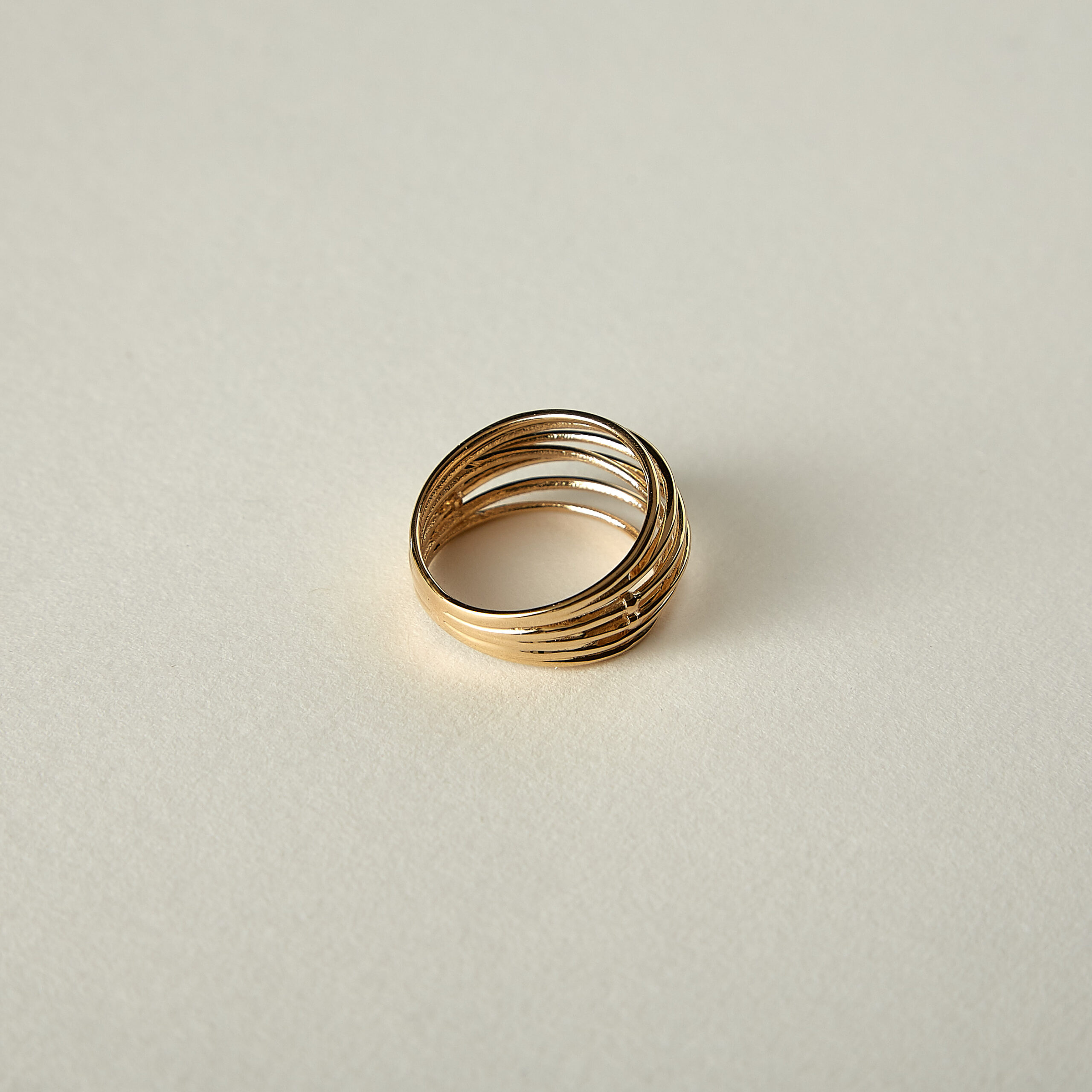 Inel din aur galben de 14 karate, format din șase linii subțiri, într-o formă ce pare să imite mișcarea unei unde. Design simplu, modern, minimalist, foarte potrivit pentru un stil modern, bine definit.